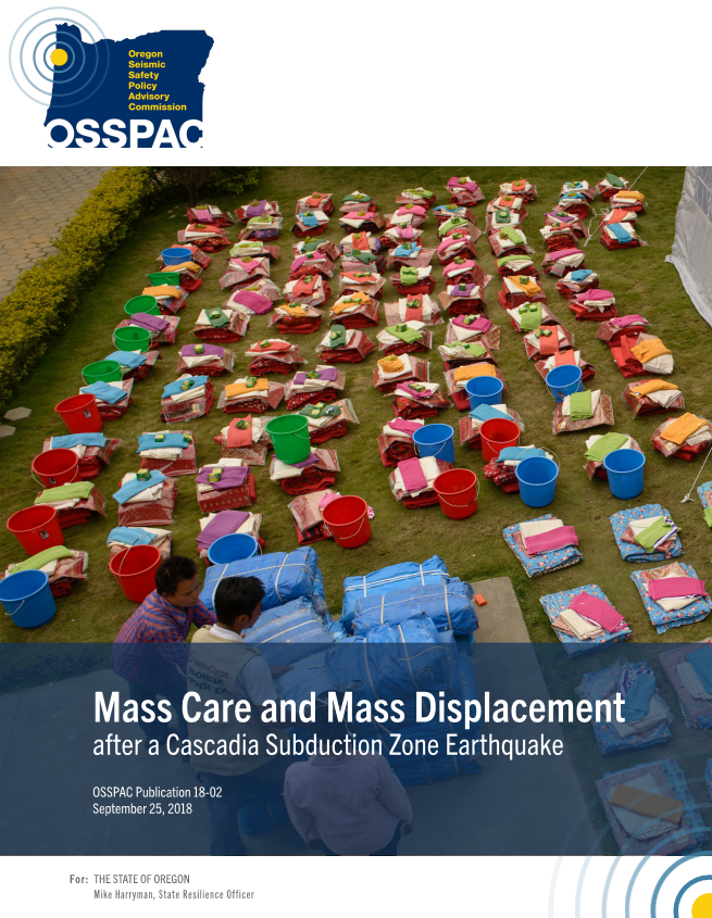 The second report is on Mass Care and Mass Displacement after a Cascadia Subduction Zone Earthquake. The Commission explored the current readiness of the State to respond to a major Cascadia Earthquake, and provided recommendations (26 in all) to improve our current preparations. This includes measures to also increase our resilience which is vital for reducing our mass care and displacement needs. As we become more resilient, we will have less dependence on services that would be overwhelmed immediately in a Cascadia event and can’t possibly provide the temporary shelter, food, water, sanitation, medicines and the host of other needs if such a large population is displaced and unable to care for themselves.